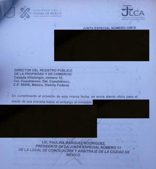 Corresponde primero a la gente de la JLCA hacer su trabajo, que es aprobar que se trabe el embargo, y ya cuando se tiene esa acción a favor, se procede a presentar los documentos ante otros cómplices, como son los del Registro Público de la Propiedad, también de la capital del país, siendo ellos quienes continúan con el despojo, y al pasar unos días, ya cuando los familiares de la víctima no pueden hacer nada, se le retira el embargo.